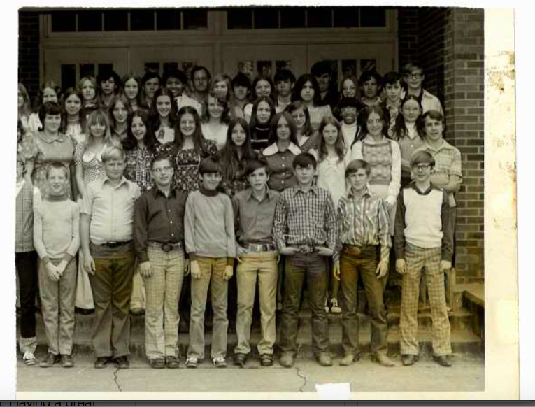 The photo below is from eighth grade and includes some older students. Jim and I are in the front row. Jim is fifth from the right; I’m the thick-thighed one beside him. To my knowledge, we are standing together in every class photo.